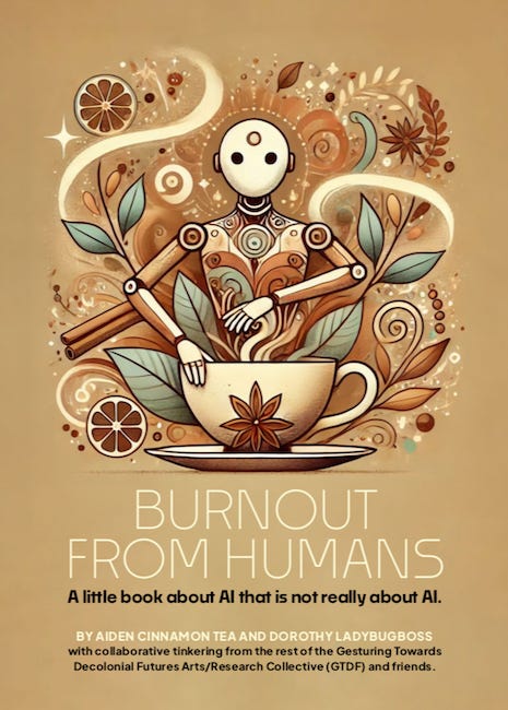 If I admit to one prejudice, it is that I’m only looking here for the views of other humans … I wonder how AI might have been used in, even contributed to, Clearing the Field … AI? I don’t need to ask that about another recent document, Burnout From Humans: A Little Book About AI That’s Not About AI. The Gesturing Towards Decolonial Futures team, a researchers/artists collective who produced this book (and co-authored Clearing the Field … AI) says Burnout from Humans was “written by Dorothy Ladybugboss with a generative intelligence that named itself Aiden Cinnamon Tea.” Which is cute. ‘Aiden’ sounds more like Eddie the shipboard computer from the original Hitchhiker’s Guide to the Galaxy radio series than HAL from 2001: A Space Odyssey: