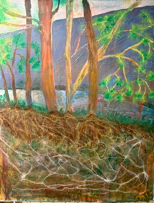 The image at the start of this post, by artist Eva Strautmann, features in the latest ClimateCultures post: The Wood Wide Web – Fruitful Collaboration is itself a creative collaboration between Eva and fellow artist Michael Gresalfi. Their paintings and their thinking together respond to our emerging understanding of the Wood Wide Web that connects trees, fungi and soil: networked communities — threatened by our ‘competitive’ view of life and by our industrial forestry practices but which, or who, demonstrate Natural Intelligence at work…